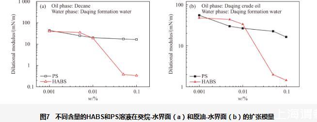 图7不同含量的HABS和PS溶液在癸烷-水界面(a)和原油-水界面(b)的扩张模量