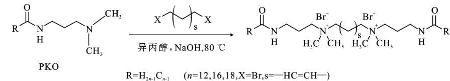 根据前期的工作[2-4]。在圆底烧瓶中,先将0.1 mol连接基化合物,反-1,4-二溴-2-丁烯溶于100 mL异丙醇中。将0.2 mol脂肪酸酰胺丙基二甲胺(PKO-12、PKO-16、PKO-18)加入反应溶液中,并以氢氧化钠0.4 g作为催化剂加速反应,在80℃下搅拌12 h。反应结束后,用真空蒸发去除溶剂,得到蜡状的粗产物。将得到的蜡状粗品固体在乙酸乙酯/乙醇(20∶1)混合溶剂中重结晶3次,得到白色粉末状阳离子Gemini表面活性剂。所制备的Gemini表面活性剂(GS-12,GS-16,GS-18)的产率分别为93.5%,92.4%,94.1%。Gemini表面活性剂GS-12,GS-16,GS-18的合成路线如下: