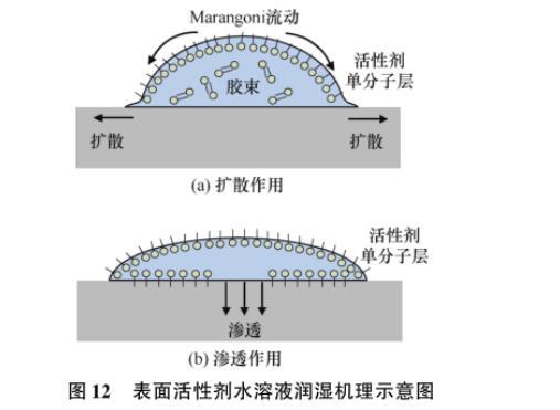 如图12(a)所示,表面活性剂分子在气-液界面的吸附行为影响着溶液的扩散。表面活性剂分子自发地从溶液内部迁移至表面,其尾部憎水基会以伸出的方式在溶液表面形成活性剂单分子层,使水溶液的表面张力下降。由于在一相或两相中,一个或多个组分在此局域(界面)的浓度与本体相中的浓度不同,所产生的张力梯度会引起界面上的质量传递即Marangoni流动效应,进而会导致液滴前沿不断扩散[42-43],在扩散作用下进一步促使液体与固体之间的接触面积增大,从而降低接触角。