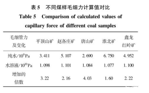 毛细管力与溶液表面张力成正比、与孔隙半径成反比;同时,接触角越小,毛细管力越大。由表5可知,朱锴[21]试验并计算煤样10 nm孔径的毛细力,发现自配的表面活性剂水溶液能够使毛细力平均提高2倍,最大提高4.03倍。如图13所示,在扩散、渗透和毛细力共同作用下,表面活性剂水溶液沿着煤体表面、孔隙和裂隙进入煤体内部产生液相滞留效应,增大煤润湿效果的同时其内部瓦斯流动阻力变大,孔隙内瓦斯气体被水溶液封堵。因此,添加活性剂水溶液能够减小水溶液的表面张力、降低水溶液与煤之间的接触角,增强煤的润湿效果,达到抑制煤层瓦斯的解吸、延缓采动煤岩体中瓦斯逸散的目的,从而降低开采工作面瞬时瓦斯涌出量。也有学者[21,29,32]分析认为,添加表面活性剂水溶液会降低煤体温度、增强煤吸附瓦斯的能力,使得部分游离态瓦斯转变为吸附态,相应地减少了瓦斯气体的逸散涌出。
