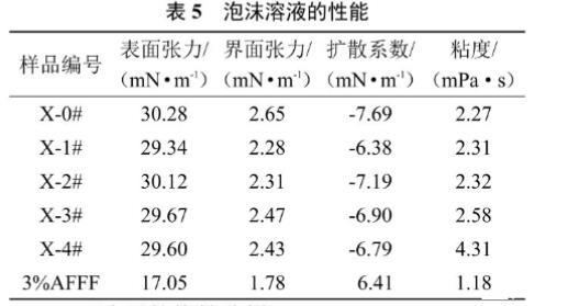 测得环己烷的表面张力为25.24 mN/m,根据式(1),6组试验组其扩散系数如表5所示。X-0#、X-1#、X-2#、X-3#和X-4#样品扩散系数都为负值。试剂复配后活性剂分子疏水基水分子之间依然有较大斥力,因此,此配方所产生的泡沫无法在油面上形成水膜[11]。X-0#、X-1#、X-2#、X-3#和X-4#样品之间的表面张力和界面张力表现出较小的差异,分别在29.60~30.28 mN/m和2.31~2.65 mN/m之间。表明XG对泡沫溶液的表面张力和界面张力影响较小,影响表面张力和界面张力的主要原因是表面活性剂的种类。X-4#样品的粘度变化比较明显,因为XG浓度的增加导致聚合物网络结构的增强,并且XG与表面活性剂相互作用:通过静电、疏水和氢键等发生,这有助于显著增加溶液粘度的协同效应。