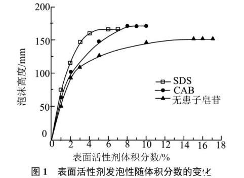 如图1所示,3种表面活性剂发泡性能随浓度增加而增大,都经过了快速增长阶段、缓慢增长阶段,最后发泡高度趋于平稳,不再随浓度增加而变化。SDS、CAB、无患子皂苷质量分数分别在5%、8%、15%时初始泡沫高度达到了最高值,分别是166 mm、171 mm、152 mm。形成大量泡沫的关键因素是表面流动性[8],以上结果表明CAB具有更好的表面流动性。