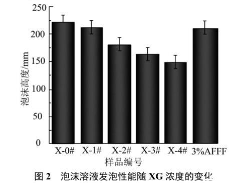表3为泡沫溶液的配方。根据三元复配体系的发泡性能,选取发泡性能最佳的9号组,无患子皂苷、SDS、CAB质量分数固定在15%、5%、5%。研究XG浓度变化对泡沫溶液性能的影响。