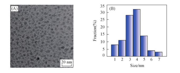 通过傅里叶变换红外光谱(FTIR)、透射电子显微镜(TEM)和X射线衍射(XRD)对DA-GQD的结构进行表征。从FTIR谱图(图S1,见本文支持信息)可知,DA-GQD可能包含C—H,O—H,O═C(R)—和C—N基团。从TEM和粒径分布图(图2)可以看出,DA-GQD颗粒比较均匀,基本上为椭球形纳米颗粒,粒径主要分布在1~7 nm,平均粒径约为3.5 nm。XRD谱图(图S2,见本文支持信息)中在20°左右有一个较宽的峰,说明合成的DA-GQD具有石墨烯结构。