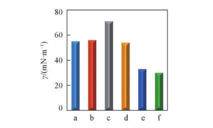 图4对比了DA-GQD与文献中常用于稳定Pickering乳液的固体颗粒表面活性剂氧化石墨烯(GO)、石墨烯(G)、GQD和氧化亚铜(Cu2O)纳米颗粒,以及典型阴离子表面活性剂SDBS的最低表面张力。结果显示,GO,G和Cu2O纳米颗粒具有较低的水溶性,可以将水的表面张力降低到50~60 mN/m之间,这主要归因于它们的强疏水性和弱亲水性;而且GO和G中的大尺寸石墨烯二维片层容易聚集在流体界面上,增加了界面层的刚性,从而导致其表面活性的进一步降低。而只以柠檬酸作为碳源,通过热裂解法制备的GQD的表面张力约为71.8 mN/m,接近纯水的表面张力。这是因为GQD具有极强的亲水性和极弱的疏水性,不合适的两亲结构赋予其低的表面活性。此外,SDBS的表面张力为32.4 mN/m,比DA-GQD水溶液略高一些,证实了DA-GQD的表面活性与SDBS相当。