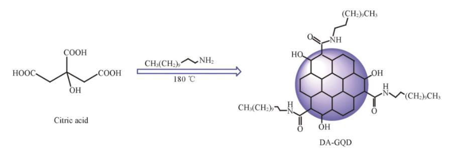 首先采用“自上而下”法,由CX-72炭黑在浓硝酸中回流24 h制备GQD。虽然能够实现一步同时制备单层和多层GQD,但是存在反应时间长、强酸会对环境造成一定污染等弊端。本实验设计通过“自下而上”法,以柠檬酸为前驱体、直链烷基胺为功能化试剂,通过一步热裂解制备双亲性DA-GQD(见图1)。柠檬酸分子之间脱水缩合形成六边形sp2碳原子键合的石墨烯片,十二胺通过氨基与柠檬酸上的羧基缩合,将烷基链引入石墨烯片的边缘以提高疏水性。