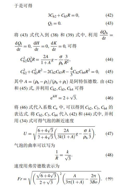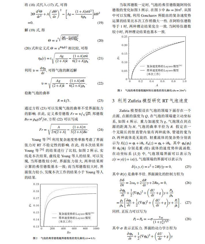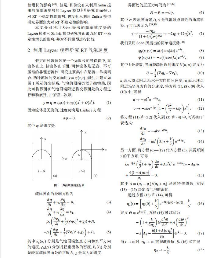 Layzer模型和Zufiria模型都是建立在理想流体之上。然而对实际流体而言,很多因素都可以影响RT不稳定性的演化情况,如密度比、黏性、界面张力、压缩性、外场加速度、Kelvin-Helmholtz不稳定性等。Young和Sohn利用Goncharov提出的复杂速度势,将Layzer模型推广并应用到非理想流体中,研究了界面张力对RT不稳定性增长的影响,发现界面张力降低了气泡的增长速率。2011年本文的作者之一利用Zufiria模型研究了黏性对RT不稳定性增长的影响。但是,目前没有人利用Sohn提出的简单速度势的Layzer模型研究界面张力对RT不稳定性的影响,也没有人利用Zufiria模型研究界面张力对RT不稳定性的影响。