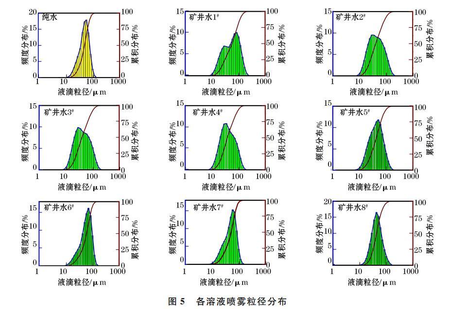 喷雾降尘效果与雾化特性参数密切相关,其中雾滴粒径是影响雾化特性的关键因素。9组溶液在15cm测点处的粒径分布如图5所示。由图5可知,各溶液雾滴粒径主要分布为25~75μm,纯水、矿井水1#至4#和矿井水5#至8#喷雾粒径位于该区间的平均比例分别为80.10%、55.87%、69.73%,矿井水1至8#的粒径累积分布曲线斜率逐渐增加,这说明矿井水雾化效果不断提升。由此可知,矿井水中Na+、K+离子浓度越低,雾滴粒径分布越集中,其雾场更有利于呼吸性粉尘捕集。这是由于矿井水表面张力减小,雾滴破碎程度逐渐提高,致使雾滴细化且粒径集中分布于25~75μm区间,这说明喷雾雾化特性随表面张力减小不断优化,雾滴粒径趋向均匀分布。综上,矿井水中Na+、K+离子浓度差异改变其表面张力,从而影响喷雾粒径分布、雾化百分比等特性。