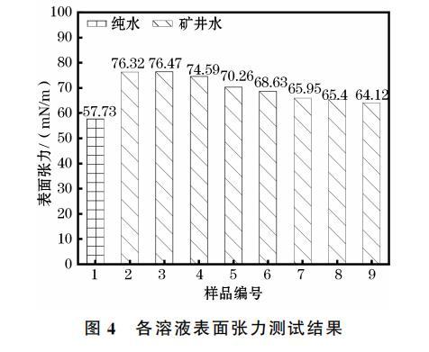 由图4可知,纯水、矿井水1#至4#、矿井水5#至8#表面张力平均值分别为57.73 mN/m、74.41 mN/m、66.03mN/m,纯水表面张力明显小于矿井水,随着矿井水中Na+、K+数目减少,其表面张力显著减弱。这是由于矿井水中Na+、K+离子浓度减小,静电力吸附有效范围扩大,吸附作用随之增强,直至界面对离子的吸附作用逐渐大于排斥作用,因此表面张力呈现减小趋势。由此可知,低离子浓度条件下,矿井水表面张力与其Na+、K+离子浓度呈正相关。在相同压力条件下,表面张力决定雾滴粒径分布,因此,纯水喷雾雾化特性略优于矿井水。综上,矿井水中Na+、K+等离子浓度通过改变其表面张力间接影响喷雾雾化特性。针对煤矿井下粉尘治理,可将降尘用水进行软化除盐处理后应用于喷雾降尘,以期降低其表面张力,优化喷雾雾化特性。