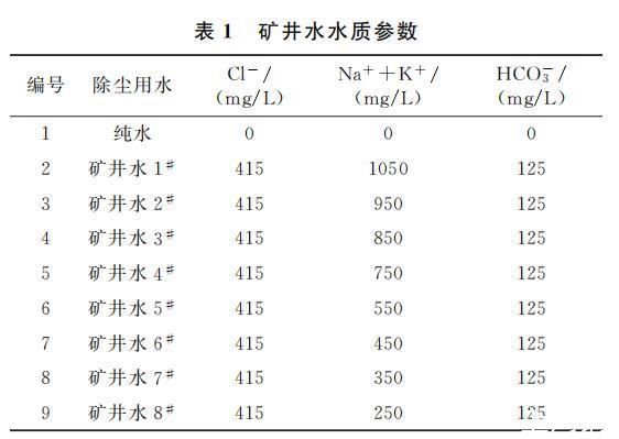 根据调研结果配制9组溶液,包括8组Na+、K+离子浓度不同的矿井水和1组纯水,溶液配比见表1。配制溶液时,取适量去离子水,向其中投加CaCl2、MgCl2、Ca(HCO3)2 控制矿井水硬度,向其中投加NaCl、HCl和NaOH控制矿井水的pH为7.5,向水溶液添加其他必需微量离子和杂质,静置2 h待用。