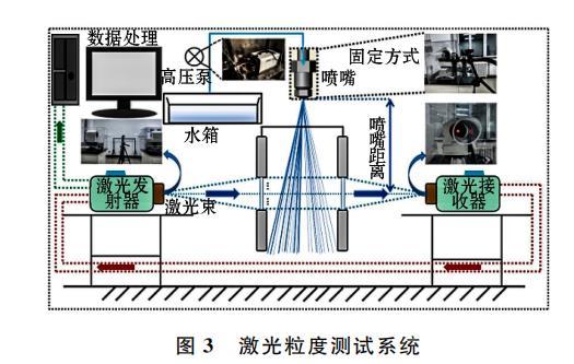 从图3可知,喷雾粒径测试主要仪器及工具包括激光粒度分析仪、高压喷雾水泵、计算机分析控制系统等。计算机分析控制系统使用PAQXOS 4.1测量软件,该软件可定义、控制整个测量过程,并在试验结束后处理测量的粒度分布数据。