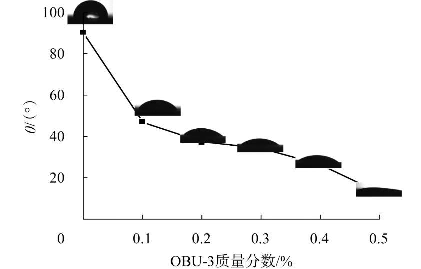 图5为OBU-3低黏表面活性剂体系中OBU-3含量对原油处理岩石薄片后接触角的影响。从图5可看出,随着OBU-3含量的增大,接触角逐渐降低。低黏表面活性剂体系含量增加,吸附达到饱和,导致油水界面张力变小,在相同条件下的吸附量少,反过来对润湿性(接触角)的改变较小。OBU-3与原油处理后的岩心表面接触角表明,OBU-3能使岩心表面由亲油性向亲水性转变,符合油藏驱油的要求。