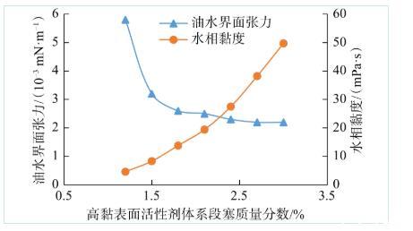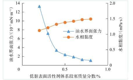 图1 OBU-3低黏表面活性剂体系含量对界面张力和水相黏度的影响