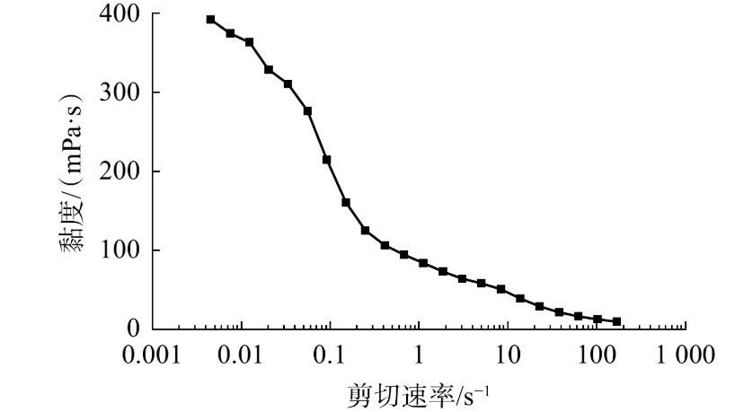 图7为小段塞的黏度随剪切速率的变化情况。从图7可看出,体系黏度随剪切速率的增加而快速降低,从392.8 mPa·s降至10.3 mPa·s。由于剪切力作用下缠结的自组装超分子链打开并发生取向,导致表面活性剂的黏度整体上随着剪切速率的上升而下降。在低剪切频率下黏度下降明显,属于典型的“非牛顿流体”,但当剪切速率进一步增大时,黏度下降缓慢。