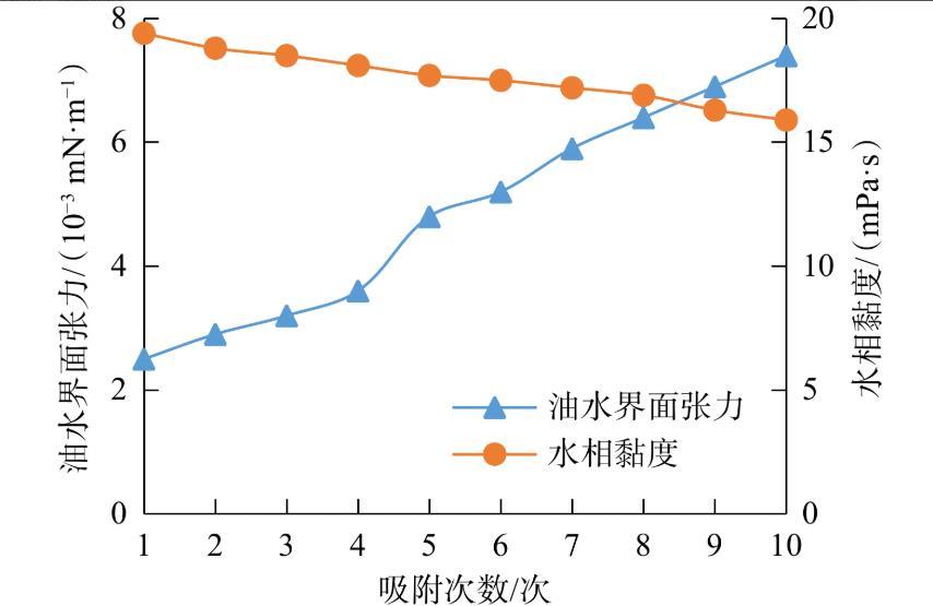 图6为使用岩心粉对质量分数为2.7%的ACS-2溶液重复进行10次吸附实验后的油水界面张力和水相黏度。从图6可看出,随着吸附次数的增加,ACS-2高黏表面活性剂体系的油水界面张力呈增大趋势,黏度值缓慢下降。ACS-2在岩心上的吸附适中,多次吸附后在油水界面上的表面活性剂仍足以使界面张力处于超低值,能达到行业内有效驱油对表面活性剂的要求。