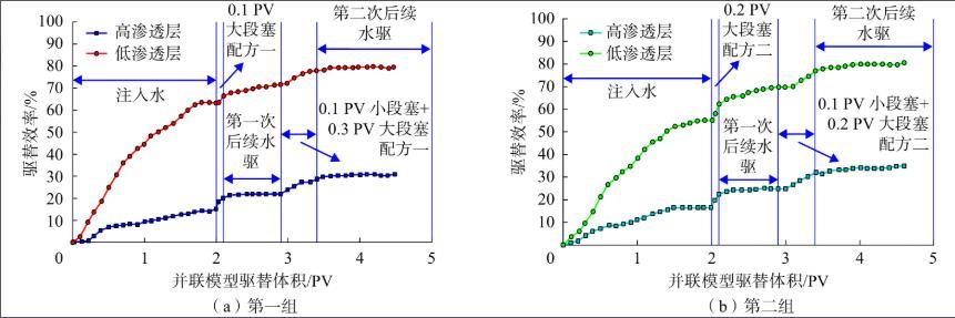 从表1可知,通过并联天然岩心表面活性剂驱油实验发现,只用大段塞驱平均提高采收率7.4个百分点,非常低。而采用组合段塞进行调和驱,第一组组合段塞驱在高低渗层分别提高驱油效率10.1个百分点和17.7个百分点。第二组组合段塞驱在高低渗层分别提高原油采收率10.2个百分点和16.1个百分点,两组组合段塞驱平均提高采收率为14.8个百分点,比只用大段塞驱平均采收率提高了1倍,达到了聚/表二驱的驱油效果。
