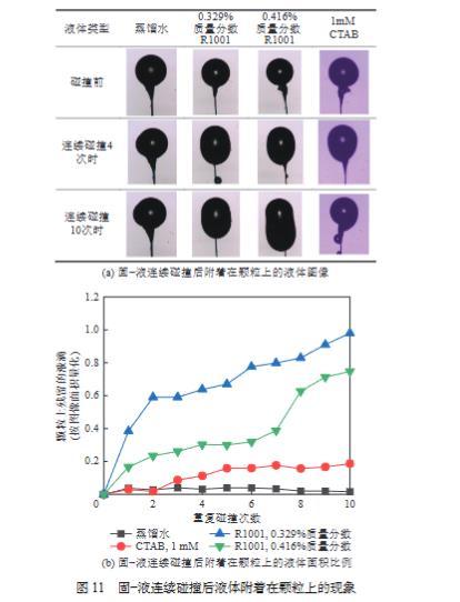 图11a对比了液滴连续碰撞疏水颗粒前后颗粒表面的液体附着状态。由于在实验中无法直接测量颗粒上附着液体的三维体积,因此笔者通过测量每次碰撞后基于二维实验图像的液滴面积的变化来进行定量对比。图11b对比了附着在颗粒上的测量的液体面积比例随碰撞次数增加而发生的变化。对比实验结果可发现,当蒸馏水滴与高疏水性颗粒反复碰撞时,保留在颗粒上的液体面积不超过5%。然而,当增稠剂被添加到水中时,在每次碰撞之后,附着在颗粒上的液体迅速增加。增稠剂浓度越高,附着在颗粒上面的液体比例增长速度越快。相反,当CTAB加入水中时,附着液体比例的增长速度比蒸馏水略快,但比增稠剂溶液明显更慢。这一结果表明,在提高疏水粉尘治理效果方面,增加液滴黏度比降低液滴表面张力更有效。此实验结果与之前的数值模拟结果相符,因此调控水雾流变特性是进一步提升其降尘效果的新思路,有望突破水雾降尘率瓶颈。