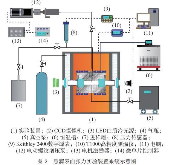 本文所搭建的悬滴法表面张力实验系统的温度和压力适用范围为 223.15 ∼ 373.15 K 和 0 ∼ 15 MPa。实验系统示意图如图 2 所示,其主要包括实验装置本体、恒温槽、温度控制与测量系统、气体增压与压力测量系统、液滴控制系统、真空系统、图像采集和数据处理系统。