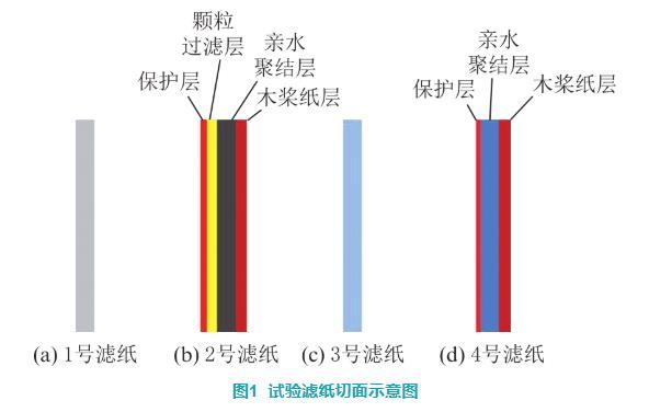 滤纸的切面结构如图1所示。1号滤纸为单层亲水材料。2号滤纸由保护层a、颗粒过滤层b、亲水聚结层c和木浆纸层d组成,木浆纸作为基层材料,c和d层、b与c层均由树脂粘结,a与b层通过超声波焊接在一起。3号滤纸为聚四氟乙烯编织而成的单层网状滤纸。4号滤纸由保护层a、疏水过滤层b和基层c组成,4号滤纸的粘结工艺与2号滤纸相同,保护层和疏水层由超声波焊接在一起,基层和疏水层使用树脂进行粘结。