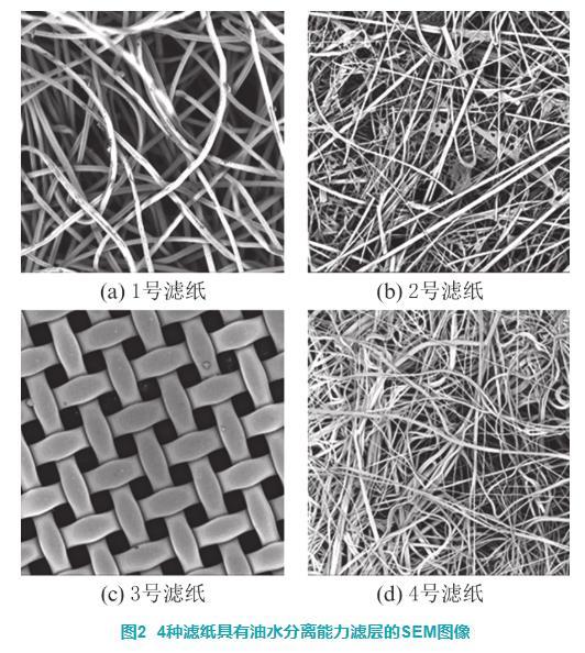 使用phonesm Pro X扫描电子显微镜(scanning electron microscope,SEM)在500倍放大倍率下拍摄的4种滤纸的微观结构如图2所示。1号滤纸由直径约为15μm的亲水纤维构成;2号滤纸的亲水层由粗细不同的纤维通过树脂粘接而成,其中粗纤维还起到增加亲水层物理强度的作用;3号滤纸由直径约为45μm的聚四氟乙烯纤维丝编制,两根纤维之间的距离约为44μm;4号滤纸的b层由疏水材料通过熔喷工艺制成,在平面上纤维分布疏密不均但在空间内有着较好的孔隙分布。除了3号滤纸外,其余滤纸均具有油水分离层,同时也具有较为复杂的空间结构。