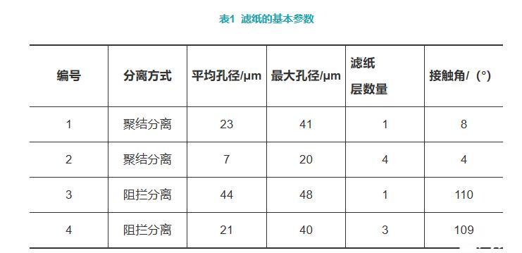 聚结式滤纸分离水的主要步骤为:(1)从不混溶的液体中传输小水滴到过滤器;(2)小水滴附着在纤维表面;(3)因聚结使附着在纤维上水滴的尺寸增加;(4)水滴在纤维上的合并和传输;(5)水滴因为重力脱离滤纸表面落到集水槽内。阻拦式滤纸分离水的原理是利用疏水纤维的疏水性,把水颗粒阻拦在滤纸表面,通过黏性聚结生长成的大水滴在重力的作用下脱离滤纸表面。