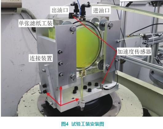 单张滤纸工装由两块50 mm厚的有机玻璃制成,在顶部加工进出油口,在底部加工放水口。单张滤纸工装和振动试验台通过一个特制的铝质底座进行连接,如图4所示。