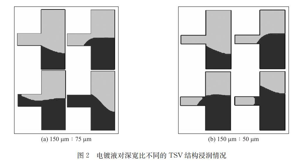 深宽比为150μm:75μm和150μm:50μm的TSV浸润仿真结果分别如图2的(a)(b)所示,前者可以完全浸润,后者在TSV底部形成气泡。模拟结果表明如果不进行充分润湿,深宽比大于2:1的TSV就会因不能完整浸润而在靠近TSV底部的位置形成部分表面紧贴TSV侧壁的大气泡,且该气泡在之后的电镀过程中难以排出,导致电镀液无法接触到TSV底部附近的位置,进而形成较大空洞。