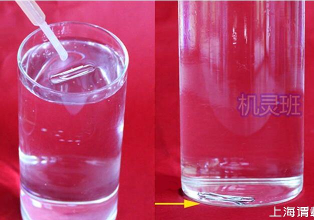而当你把洗洁精滴入水里,会破坏水的表面张力,使得水的表面张力不足以支撑回形针,因此回形针会下沉至玻璃杯的底部。