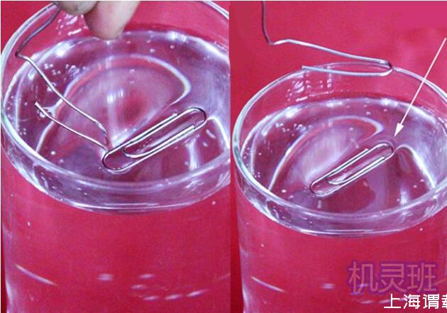 水分子之间的吸引力即为水的表面张力。实验中以第二次的方式将回形针放在水面上时,回形针受到最大的水面张力的支撑,因此它才会浮在水面上。