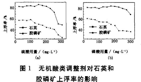 硫酸和磷酸是较为有效的胶磷矿抑制剂,工业应用广泛。考察传统调整剂对石英和胶磷矿可浮性的影响,结果见图1。