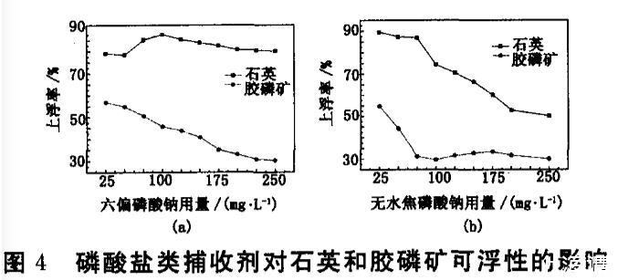 除了上述调整剂,含有磷酸根的六偏磷酸钠及无水焦磷酸钠也可抑制胶磷矿,这类磷酸盐除了可以在酸性条件下抑制胶磷矿外,还能在矿浆中起到一定的分散作用。试验结果见图4。