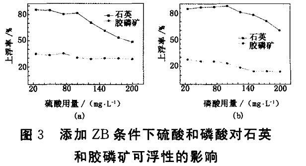 此外使用ZB和硫酸及ZB和磷酸组合的复配药剂作为调整剂进行试验,控制ZB用量为150 mg/L,分别考察添加不同用量的硫酸和磷酸对石英和胶磷矿可浮性的影响,结果见图3。