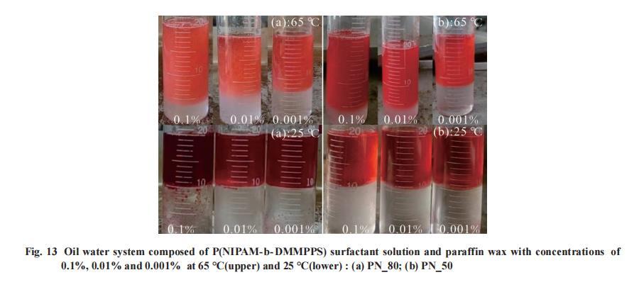 用PN_80进行乳化性能测试符合上述温度响应机理。油水体系中,质量分数为0.1%的PN_80溶液能够在高温形成乳液,在温度降低至25℃时破乳,如Fig.15所示。此嵌段聚合物LCST在36°C左右,低温时PDMMPPS链段疏水收缩,PNIPAM链段亲水舒展,聚合物整体表现为亲水性;当温度升高至65℃,PDMMPPS链段亲水舒展,PNIPAM链段疏水收缩,聚合物整体表现疏水性。
