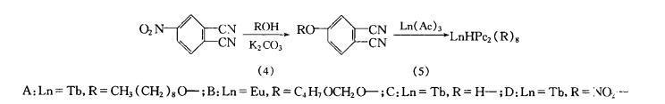 配合物A、B的合成:以邻苯二甲酰亚胺为原料,经硝化、氨解、脱羰基、取代等反应,合成正壬氧基邻苯二腈和4-氢糠氧基邻苯二腈。在氮气保护下,取代邻苯二腈和醋酸稀土(Tb、Eu)(III)以8:1的摩尔比在260℃反应6h,得绿色固体,溶于氯仿中。经Al₂O₃(100目)色谱柱分离,收集绿色溶液,蒸干溶剂,得绿色粉末,经元素分析、红外光谱和质谱加以确认。合成路线如下: