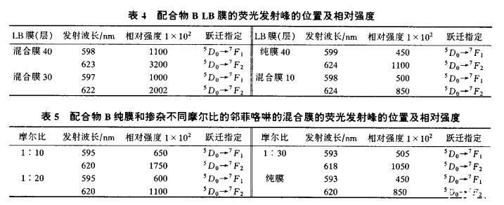 配合物B和邻菲咯啉摩尔比为1:10时,制成40、30、10层混合LB膜,与40层纯膜进行比较。结果表明(表4):同层数的混合膜与纯膜相比,混合膜的荧光性远高于纯膜。实际上,30层的混合膜荧光强度就比纯膜40层的强。说明邻菲咯啉吸收能量后再传递给稀土离子,起着分子间传递能量的作用。使混合膜的荧光强度增加。当配合物与邻菲咯啉的摩尔比变为1:20和1:30(20层)时,荧光强度反而下降(表5)。