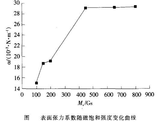 由图7可知,α与Ms有关。Ms小于120Gs时,α与Ms成正比;大于120Gs小于200Gs时,α缓慢增加;大于200Gs小于440Gs时,成线性增加;大于440Gs时,基本恒定。这种变化规律主要是由于不同磁饱和强度的磁性液体所含磁性颗粒的数目不同所致。