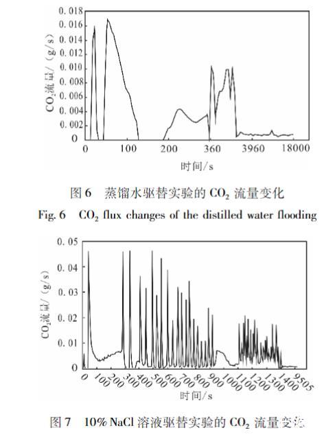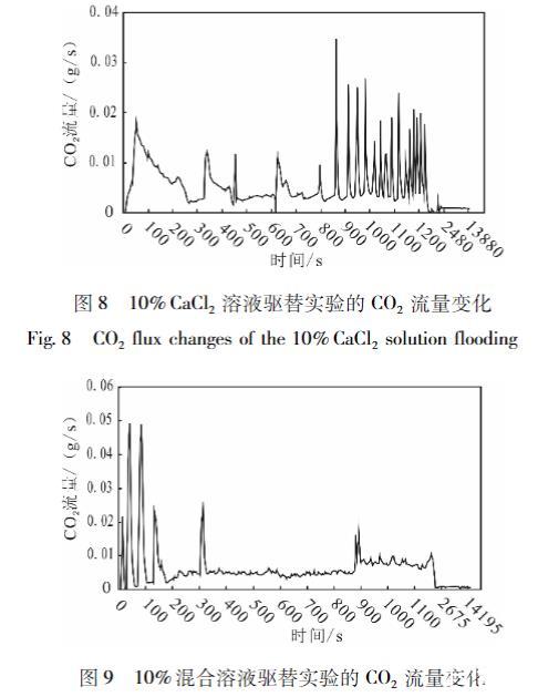 由CO2流量曲线可以发现,以驱替液突破岩心为分界点,也可以将CO2流量随时间变化划分为两个阶段:驱替液突破岩心前,CO2流量随时间都发生较大的波动(活塞式驱替阶段);驱替液突破岩心后,CO2气体流量迅速减少,并且最终趋于一个稳定值,CO2流量曲线几乎不再波动带式驱替阶段)。因为活塞式驱替阶段中驱替出的CO2速率是剧烈变化的,所以CO2流量随时间发生了较大的波动。这一稳定值的出现,是因为实验开始一段时间后,岩心中可被驱替的超临界CO2已被完全驱替,岩心中只剩下被毛细力所束缚的CO2。驱替液流出后,由于温度和压力的降低,本来溶解在驱替液中的CO2散逸出来,而驱替液初始溶解的CO2量是一定的,散逸出的CO2也是一定的,所以CO2气体流量最终趋于稳定。对比图6一图9发现,10%NaCl和10%CaCl2溶液驱替实验的CO2流量曲线随时间波动最为剧烈,混合溶液次之,波动最小的是蒸馏水驱替实液验的CO2流量曲线。