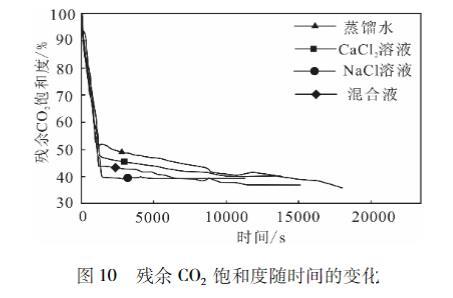 活塞式驱替阶段:驱替液突破岩心前,驱替过对岩心中CO2的推挤,将岩心中大部分不受毛细力控制的CO2气体排出,驱替出的CO2气量大,残余CO2饱和度随时间迅速减小。携带驱替阶段:驱替液突破岩心后,岩心中的大部O2气体已被驱出,驱替液只能裹挟出受毛细制较弱的部分气体和残留的小部分自由气体,所以从岩心中驱替出的CO2迅速减少,残余CO2饱和度随时间减小的速率也大大降低,随着岩心CO2气体不断减少,残余CO2饱和度最终趋于定。不同溶液驱替条件下残余CO2饱和度趋于的速率由大到小依次为:10%CaCl2溶液、%NaCl溶液、蒸馏水。第二阶段对最终的残余CO2饱和度贡献很小。本实验所使用的是饱和了CO2的驱替液,所以不存在Li等实验中的残余饱和度曲线的溶解式驱替阶段。