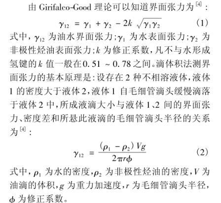式中,γ₁₂为油水界面张力;γ₁为水表面张力;γ₂为非极性烃油表面张力;k为修正系数,水不与水形成氢键的k值一般在0.51~0.78之间。滴体积法测界面张力的基本原理是:设存在2种不相溶液体,液体1的密度大于液体2,液体1自毛细管滴头缓慢滴落于液体2中,所成液滴大小与液体1、2间的界面张力、密度差和所悬此液滴的毛细管滴头半径的关系为: