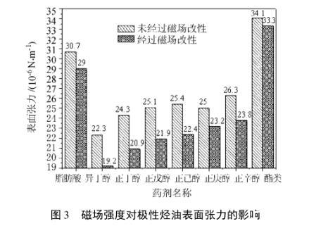 2)经过磁场改性后,极性烃油的表面张力会降低。