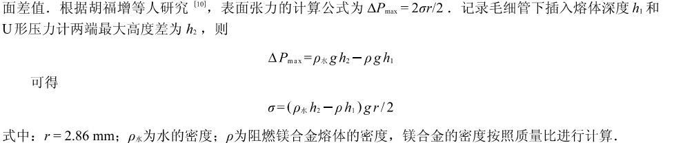 本研究采用“最大气泡压力法”测量阻燃镁合金熔体的表面张力。实验装置见图如图2所示。采用高纯度氩气作为工作气体,干燥瓶中装有CaCl2用于干燥气体,毛细石英管直径为2.86mm,端口经过抛光、清洗处理,U形压力计工作液体为纯净水。