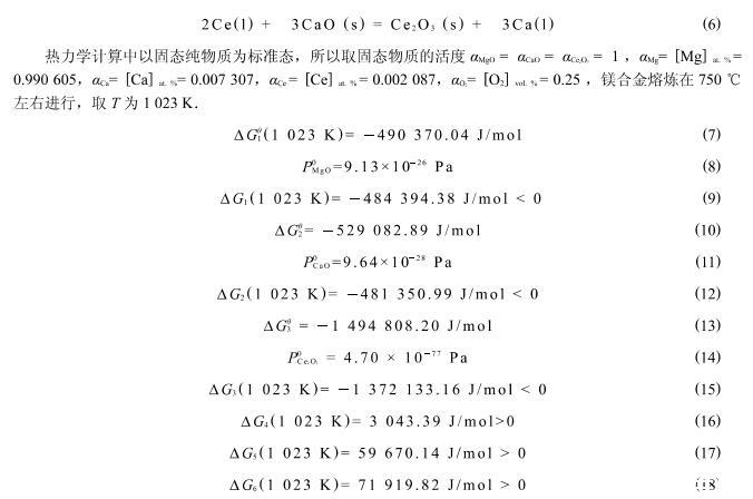 但由于Ce元素在合金熔体中是分布不均匀的,如图6所示的点能谱分析可以看出,Ca和Ce在此处的相对原子分数分别达到了2.50%和3.34%.按照此处的原子活度计算得到:Delta G_4(1023~K)=-12885.19~kJ/mol<0,Delta G_5(1023~K)=17418.58~kJ/mol>0,Delta G_6(1023~K)=56138.14~kJ/mol>0,在此处式(4)中的反应可以自发地进行.由此可知,式(4)、(5)、(6)的反应在局部元素分布不均匀的区域有可能发生置换反应.