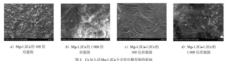 图4 Ce加入对Mg-1.2Ca合金氧化膜形貌的影响