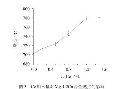 1)在一定范围内,随着Ce含量的增加,合金的燃点也随之提高,当Ce含量达到1.2%时,合金的燃点能达到780℃。