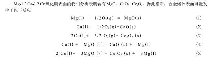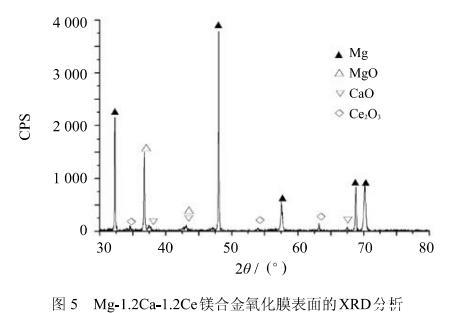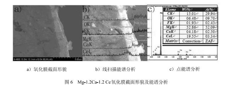4)通过氧化膜的截面检测和热力学计算分析得出Mg-1.2Ca-1.2Ce的形成的氧化膜大致分为3层:外层是MgO,中间层是CaO,内层是Ce2O3。