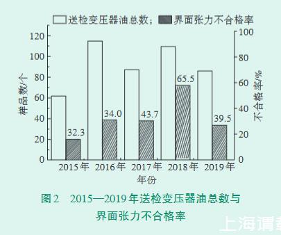 2015—2019年送检变压器油总数与界面张力不合格率如图2所示,不合格率均高于30%,其中2018年高达65.5%。