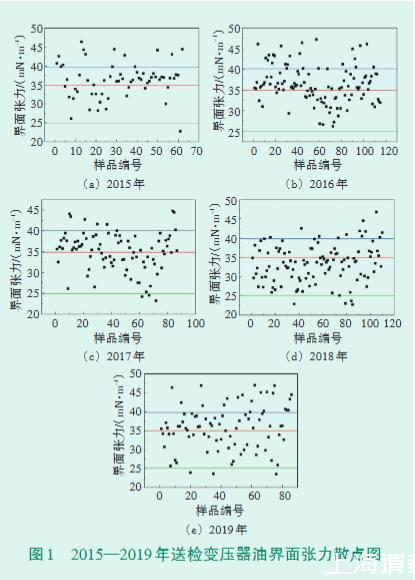 对2015—2019年内蒙古西部地区入网送检变压器油进行界面张力分析,结果如图1所示。GB/T 2536—2011《电工流体变压器和开关用的未使用过的矿物绝缘油》和GB/T 14542—2017《变压器油维护管理导则》规定,变压器新油界面张力应≥40 mN/m,投运前变压器油界面张力应≥35 mN/m,运行中变压器油界面张力应≥25 mN/m。