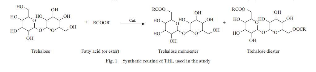 海藻糖脂(THL)是一种含有海藻糖亲水部分的糖脂,可以降低界面张力并增加疏水化合物的假溶解度。海藻糖脂具有多样的结构特征,并已用于各种工业应用,例如农业中的生物农药,以及食品工业中的乳化剂和防腐剂。海藻糖脂在清洁、乳化、发泡、抗菌活性方面的多功能特性,使其在化妆品中具有多种应用潜力。作为糖脂表面活性剂,海藻糖脂由多种微生物产生,其疏水区域表现出从短链到长链和复杂脂肪酸链的多种结构。生物合成产率低是生物表面活性剂的常见问题,这阻碍了其大规模生产。目前,通过化学合成制备的具有简单结构的海藻糖脂是生产的更好选择,本研究中使用的海藻糖脂的合成路线如图1所示。本研究中使用的海藻糖脂由绿色原料(淀粉、棕榈油等)通过脂肪酸酯和海藻糖之间的酯交换反应制成,利用来自淀粉的葡萄糖和从棕榈油提取中获得的脂肪酸(酯)。