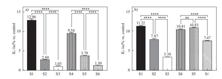 IL-1a值是从用稀释的表面活性剂复合物S1-S6(浓度为0.015%和0.020%)处理24小时后收集的上清液进行分析的。选择的处理浓度是细胞仍然存活,同时可以观察到IL-1a释放差异的浓度(数据未显示)。IL-1a值与未经任何处理的对照样品校准后进行比较。如图4所示,在表面活性剂复合物中加入海藻糖脂(S3和S6)可显著减少二元体系S1和S4的细胞因子释放。但在SMCT/CAPB体系中加入DG(S4 vs S5)在0.02%时并未抑制IL-1a释放。此外,海藻糖脂比DG更能降低IL-1a释放,且差异显著(S3 vs S2,S6 vs S5)。在浓度效应方面,它对三元体系(S2-S3,S5-S6)影响更大,意味着非离子表面活性剂可以在较低浓度下进一步抵消离子表面活性剂对IL-1a的刺激。