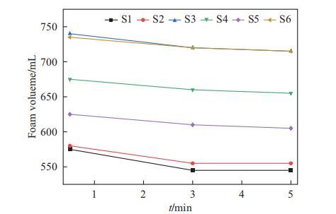 表面活性剂复合物的发泡性能评估如图3所示。通常,SMCT体系显示出比SLES体系更好的泡沫性能(S4 vs S1,S5 vs S2,S3≈S6)。以30秒时的泡沫体积为例。对于SLES体系(S1-S3),二元体系S1和三元体系S2(含DG)的泡沫体积相似,约为575 mL,而S3(含海藻糖脂)的泡沫体积约为740 mL。对于SMCT体系,二元体系S4的泡沫体积约为675 mL,加入DG(S5)后降至625 mL,但加入海藻糖脂(S6)后增加至约740 mL。这表明在二元SLES或SMCT体系中加入DG并未增强发泡性能。然而,在含有海藻糖脂作为辅助表面活性剂的复合物S3和S6中观察到了协同效应。这种增强的发泡效果可能归因于在SLES和SMCT体系中加入海藻糖脂后表面张力的降低。
